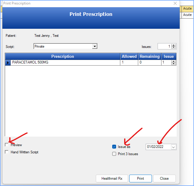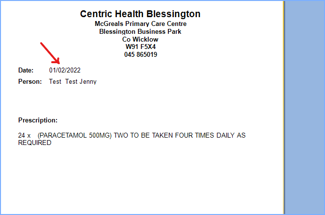 In the print dialogue box, there is an option, issue as which defaults to today’s date but you can if you wish change this to another date and this is the date that will appear on the prescription.