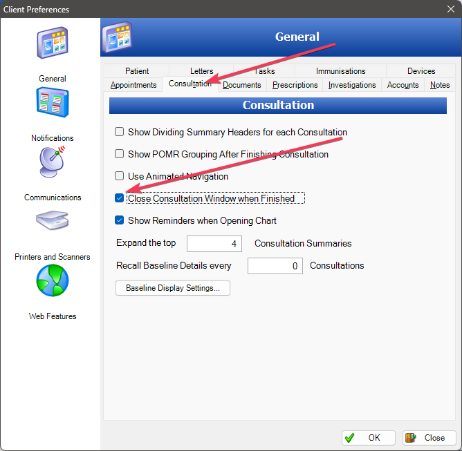 Click on the Consultation tab, and put a tick beside “Close Consultation Window when finished” Click OK