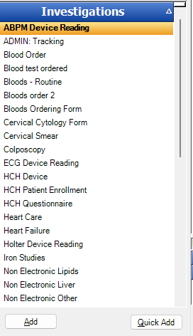 Local Investigations: These are investigations built into your local Socrates, some are pre-loaded and more can be created for doing various tasks. Cervical Smear is an example of a pre-loaded one, and blood tests is an example of a created one which you may or may not have.