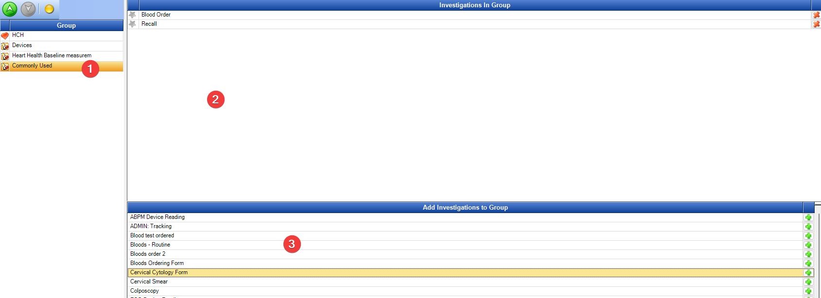 To add an investigation click on the green + at the end of the name on the right hand side in area 3. It will now appear in area 2.