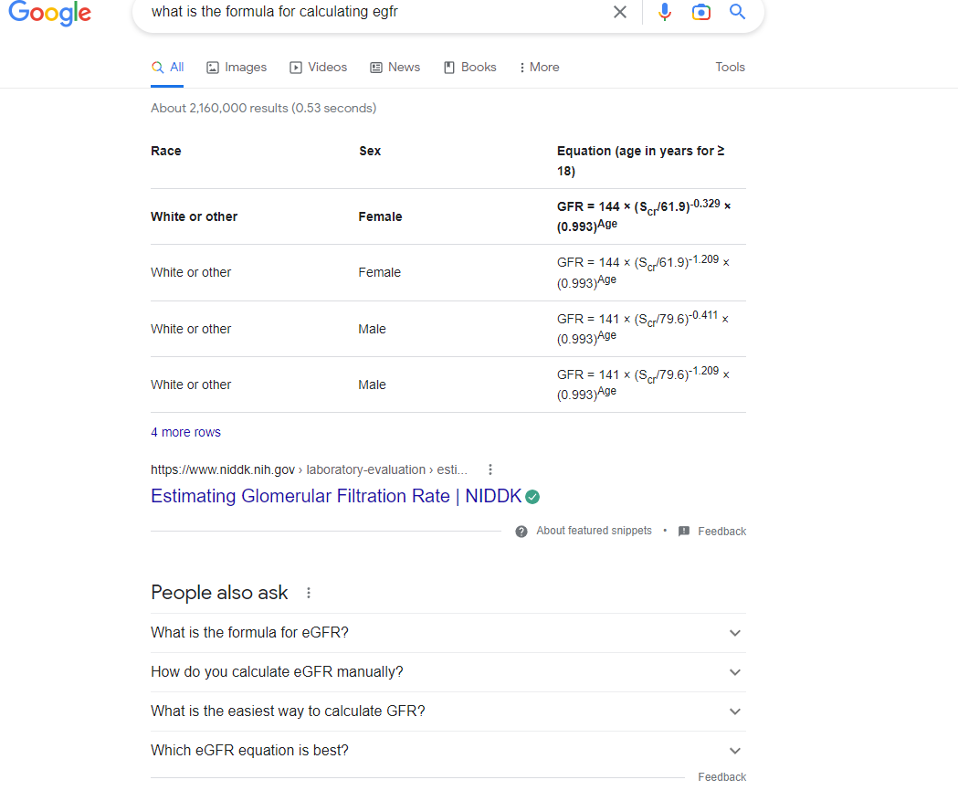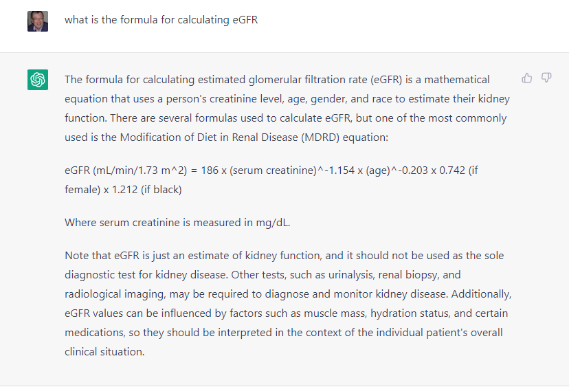 Here is an example of what it can do. I asked it what is the formula for calculating eGFR