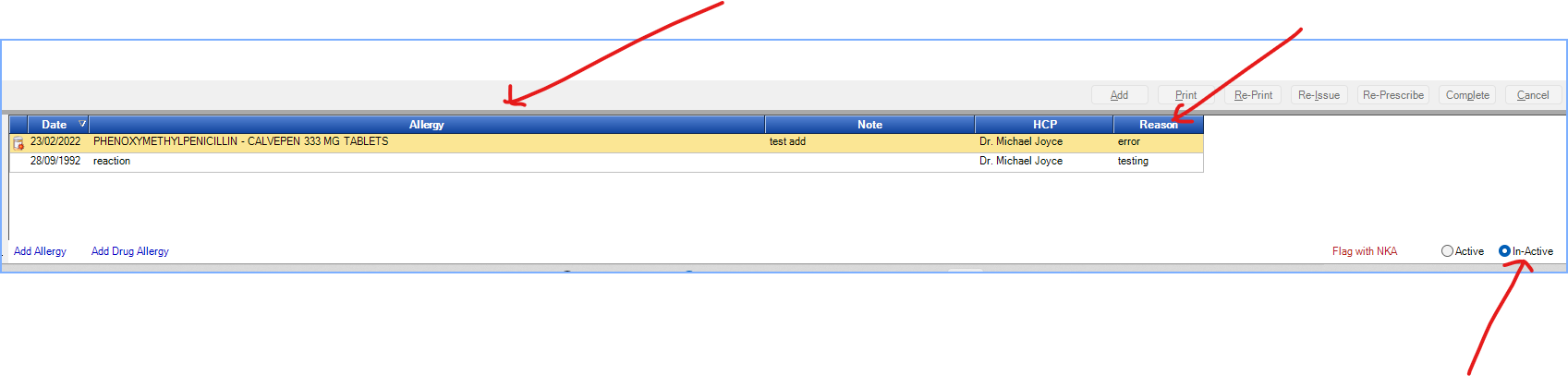 In fact, it’s not actually removed, it is made inactive. If there are inactive allergies you can see these by clicking on the inactive button, bottom right. This displays inactive allergies including the reason they were made inactive.