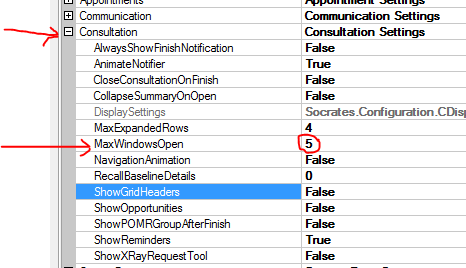 1: Change the maximum number of files that can be open at a time: The default is 4 but it can be changed up or down. Think carefully about this before you do it, the more files you have open the more likely you are to make an error. Anyway, to change it expand the consultation tree and change the value in the MaxWindowsOpen table to the desired number. In the example below I have made it 5.