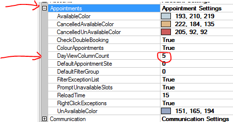 2: Change the number of columns to display by default on the appointment screen: open the Appointments table and set the value of DayViewColumnCount to the desired number, 5 again in the example below.