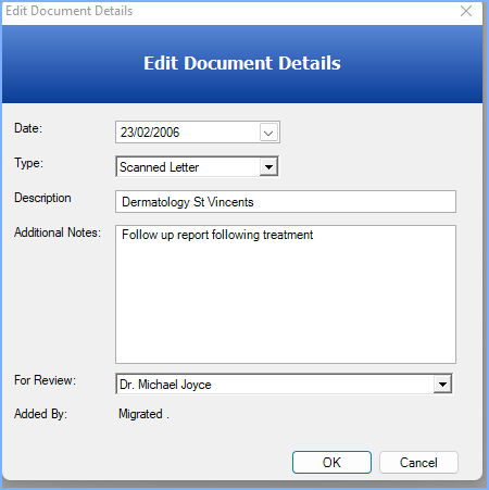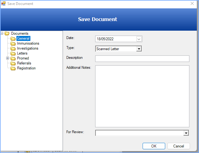 A Quick tour of this dialogue: On the left hand side you can put a document into sub folders if you wish, Date is date scanned in, Type usually scanned letter, there are options, Description is Description of the document, eg Dermatolgy St Vincents and appears in writing beside the document in the display.