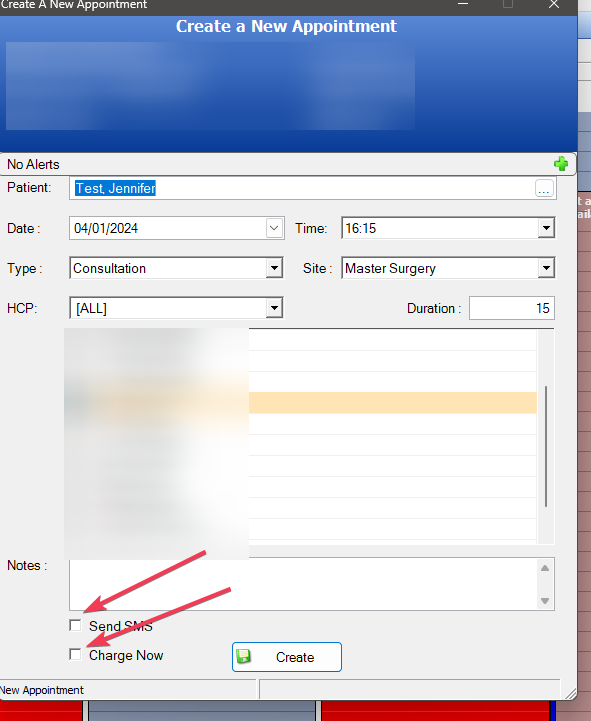 A new box to tick that will send an SMS immediately to the patient when creating an appointment with the appointment details has been added. It is at the bottom on the create appointment dialogue. Tick it and an SMS will be sent straight away. There is also a charge now button,, I’m actually not sure if that was there before, you can use it to raise an invoice at the time of booking an appointment.