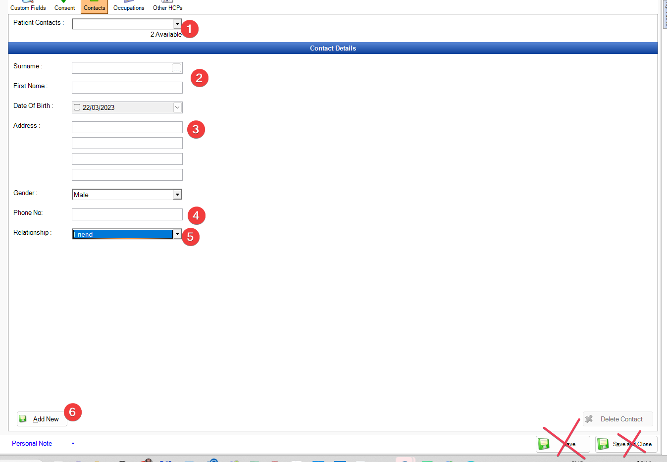 In here you can save one, or multiple contacts for the patient.