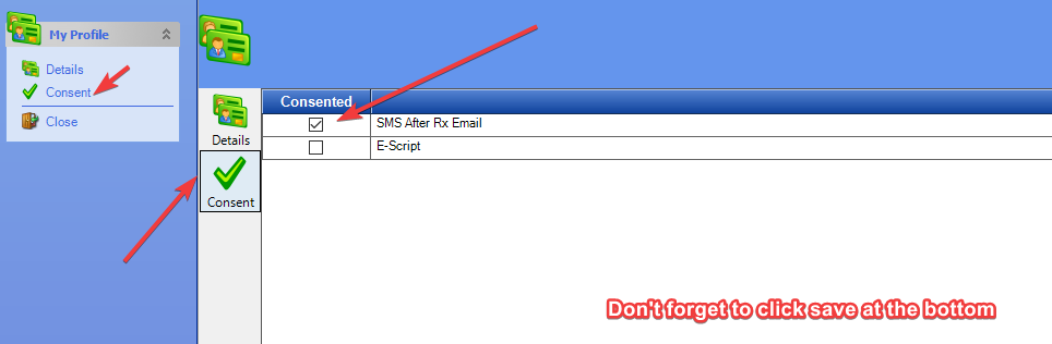 On the left hand side there is also a section called consent. Click on consent. In here there is a section called SMS after Rx Email with a tick box beside it. If you want the feature tick it, if you do not want the feature untick it. Don’t forget to click save at the bottom.