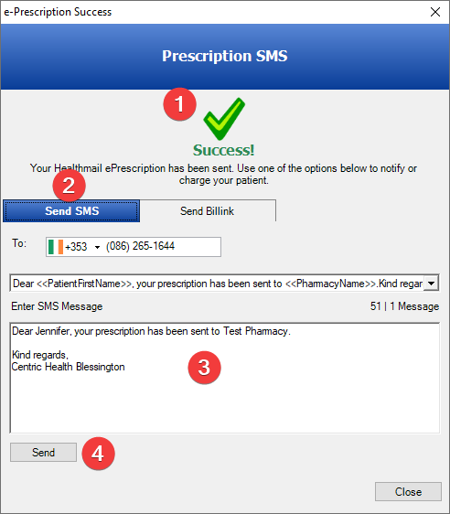 The dialogue confirms sending the text but leaves the dialogue open. You can now also send a Billink for payment or alternatively if you don’t want to send a Billink click Close to close it.
