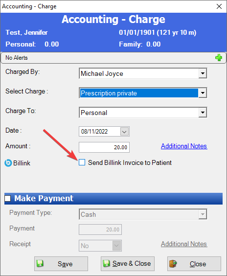 Instead of sending an SMS click on Send Billink. This opens up he charge dialogue and you can enter the relevant charge e.g. Prescription and the standard billink sms will be sent to the patient.