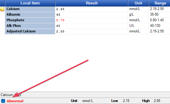 As you know if the Lab marks a blood result as abnormal the result appears in red in investigations. When you open the investigation the individual the item that is abnormal appears in red.