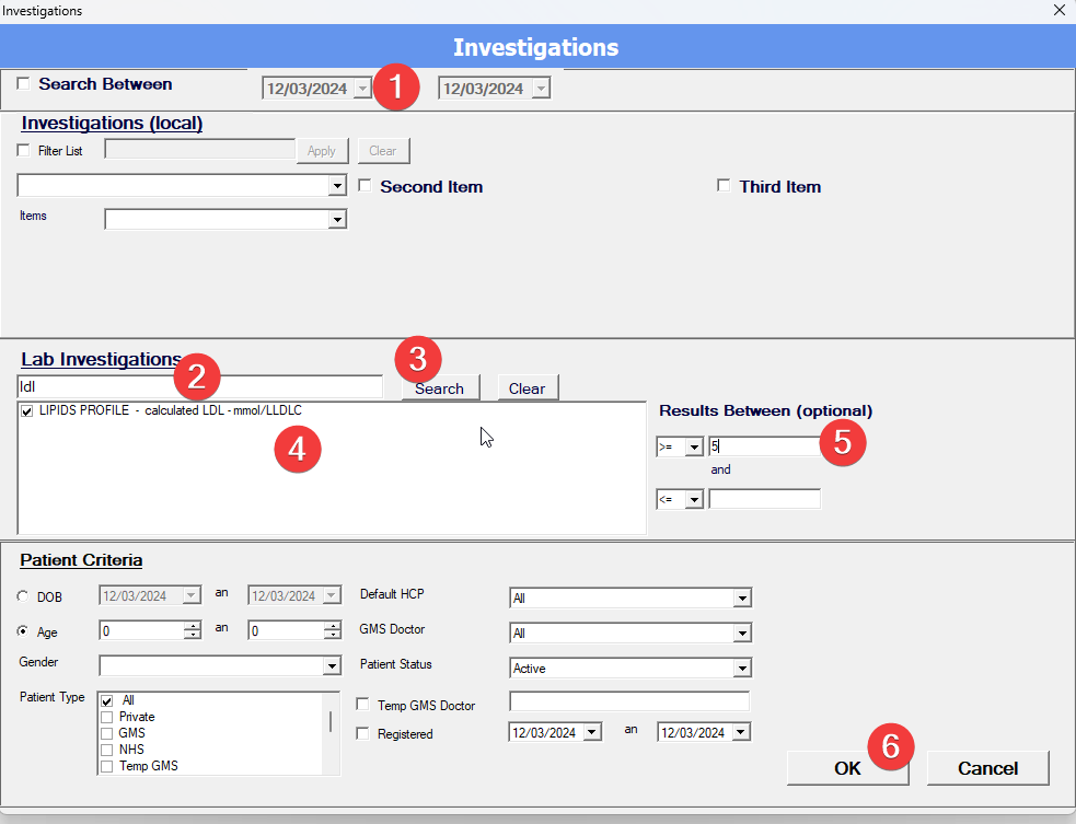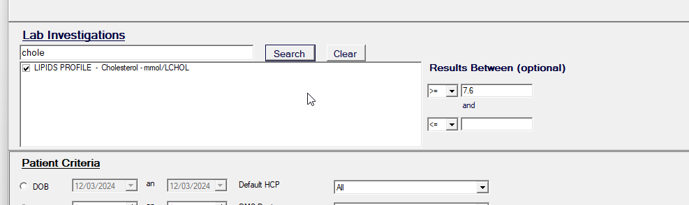 I was recently asked how to generate a report based on two criteria e.g. patients with LDL 5 and above, and/or Total cholesterol of 7.6 and above?