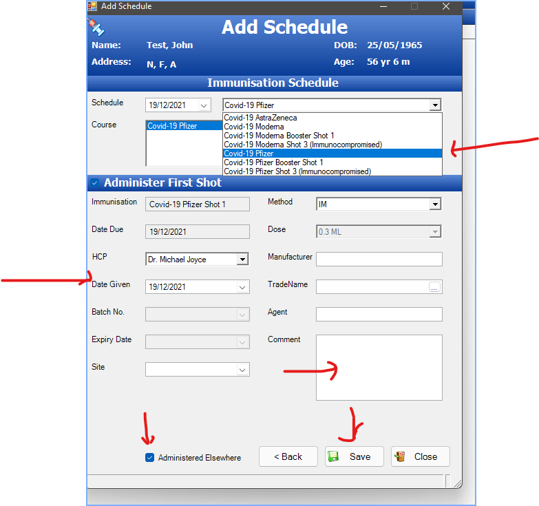 To do this you pick the “Covid 19 Pfizer” schedule. To enter the details of the first vaccine click on administered elsewhere. Don’t forget to change the date so that the correct date given is displayed (and the second shot becomes due). You can put in a comment if you wish, then save. It will save the vaccine as given but not send a message to the HSE.