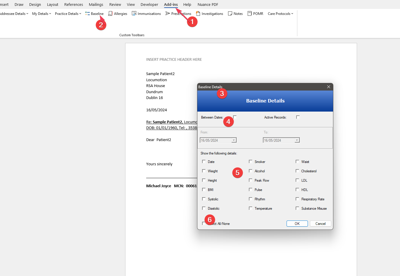 2: Alternatively, if you execute a document e.g. standard referral letter, you can use the add ins function to print base line details and there is choice here about what base line details to include in the letter.