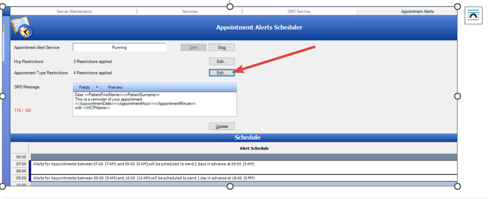 To do this in broad brush strokes, open server manager. Go to Services then appointment alerts.