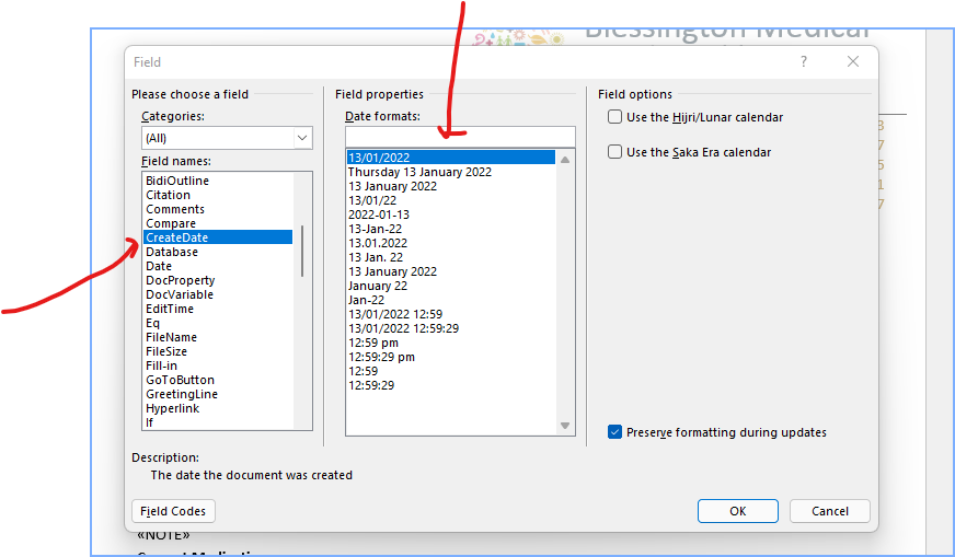 Then in the insert field dialogue pick CreateDate and pick your date format and click OK. Note date here does not work the way we want it too, use CreateDate. This inserts a new date field into your template that will always display the date the letter was written.