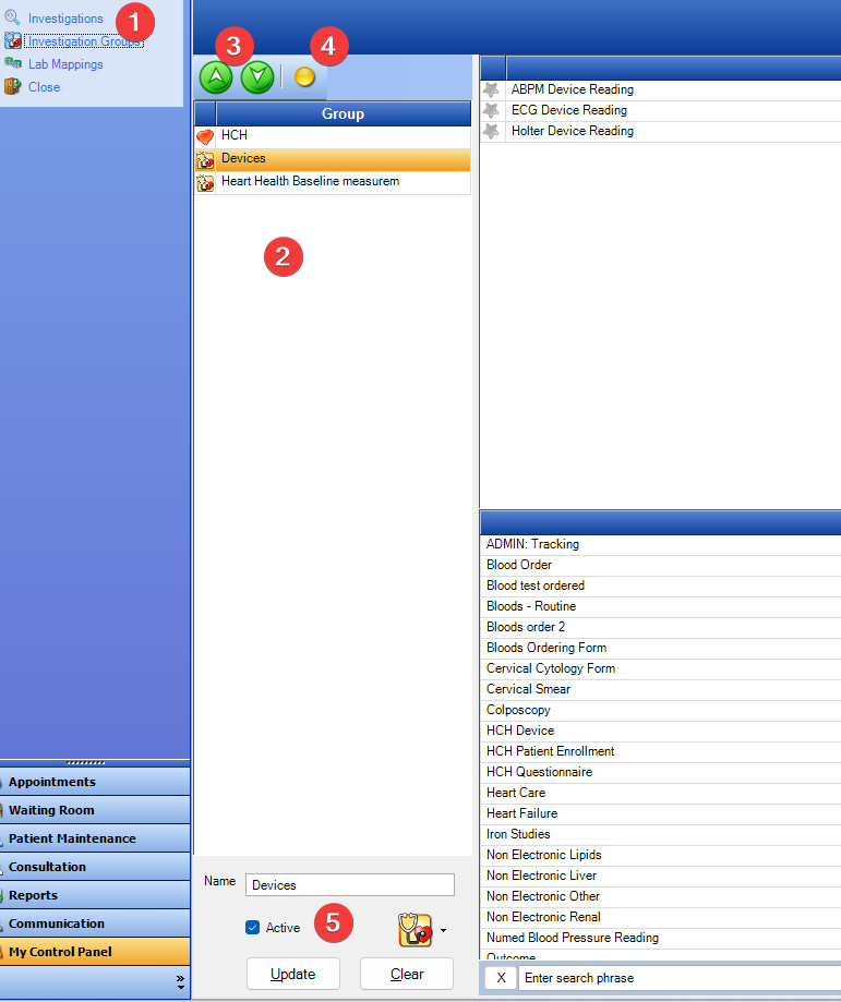 4: To add an investigation to a group click the green + sign beside the name of the investigation. It will appear in area 2 above.
