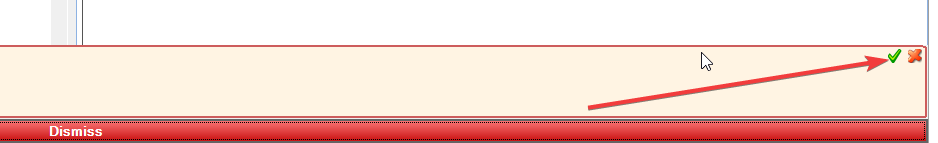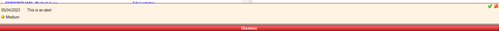 If you click Dismiss, the alert sits at the bottom of the screen and will reappear the next time you open the file (or appointment/accounts). If the alert has been dealt with you need to click on the green arrow, this marks it settled and it will not appear next time.