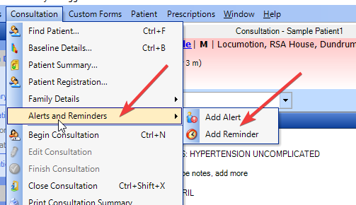 To add an alert or a reminder, when the file is open ( it can be done even if the top is red) go to Consultation on the menus bar and click add alert or reminder. Fill in as appropriate.