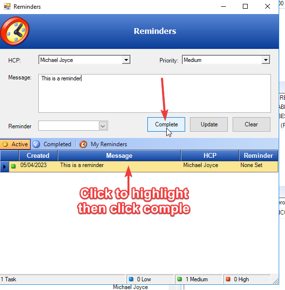 It is less clear how to remove reminders and this is because there is a completed button but this does not complete the reminder – it actually shows you any reminders that have been completed.