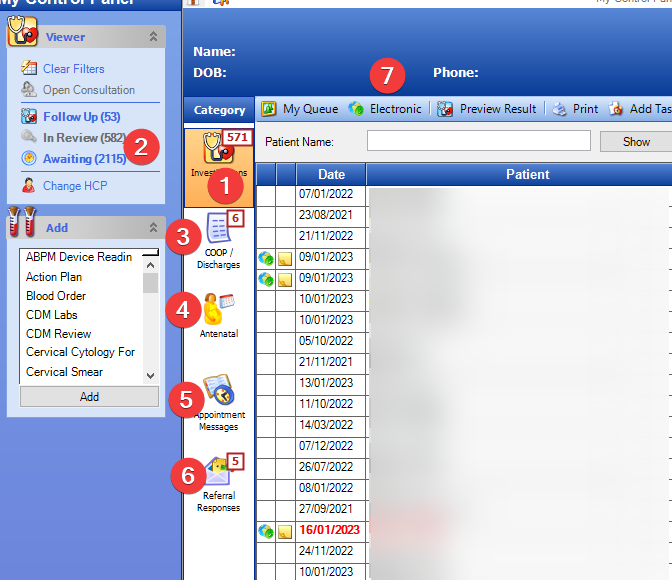 7: If Electronic is highlighted only electronic results are displayed. Note if you open the results via the result viewer in my control panel this is turned off but if you open it from the notifications this is turned on by default. This has the side effect that if you are using the blood order investigation for tracking bloods you might not see the blood order investigation. I recommend you get into the habit of turning it off.